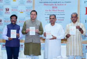 सीएम धामी ने फिलॉसोफी एंड एक्शन ऑफ़ आरएसएस फॉर हिन्द स्वराज का लोकार्पण किया।
