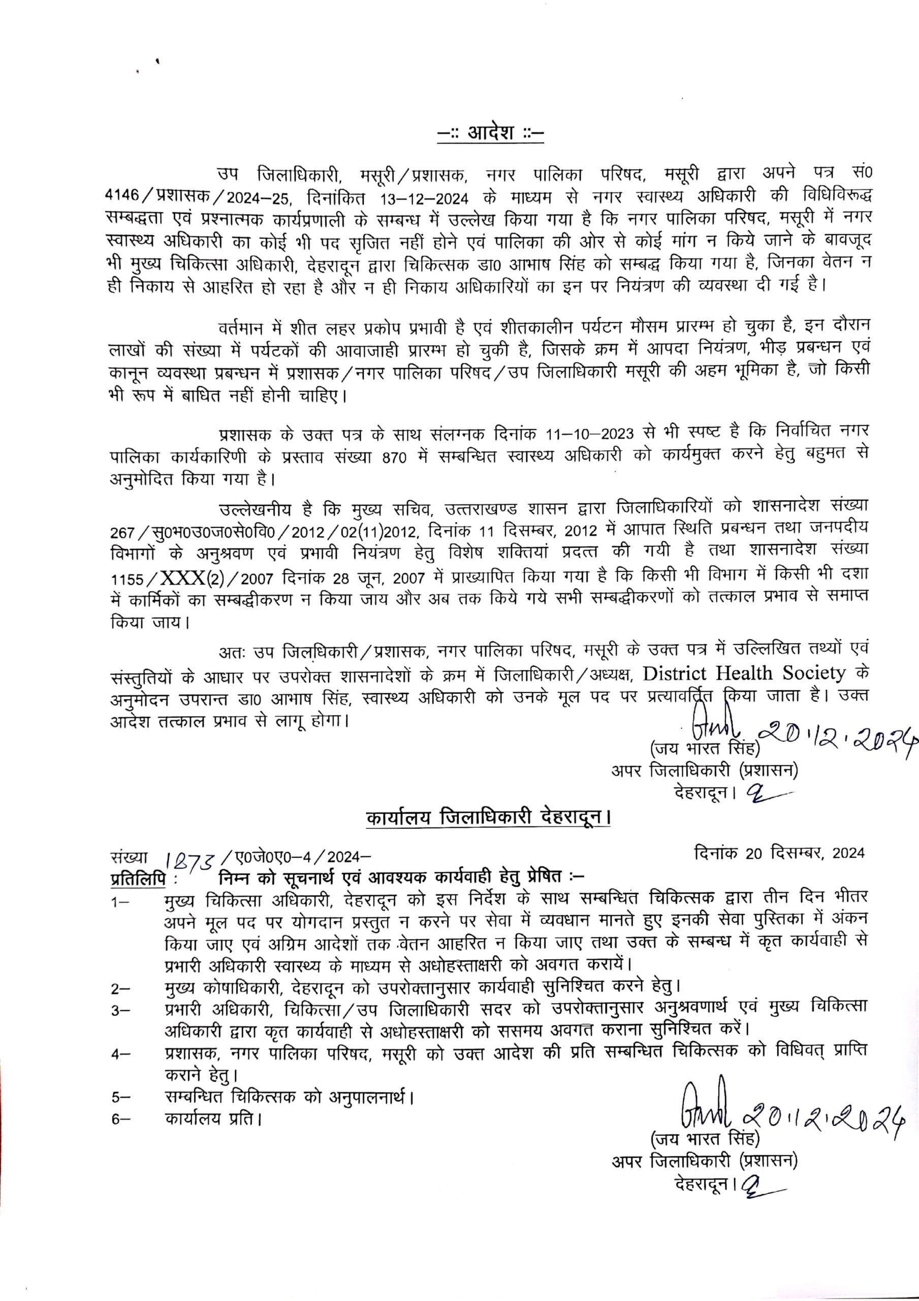 त्वरित सख्त एक्शन लगातार जारीः नगर पालिका परिषद मसूरी में विधि विरूद्ध सम्बद्ध नगर स्वास्थ्य अधिकारी को मूल पद हेतु किया unceremoniously/disgracefully कार्यमुक्त ।